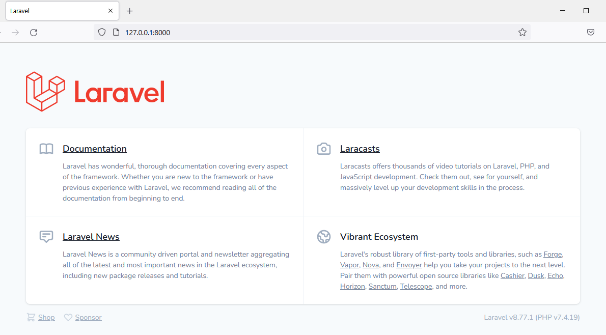 이렇게 되면 웹브라우저의 주소창에 http://127.0.0.1:8000/ 을 입력하여 접속하면 아래의 사진처럼 라라벨 프로젝트가 정상적으로 실행된 것을 볼 수 있다.