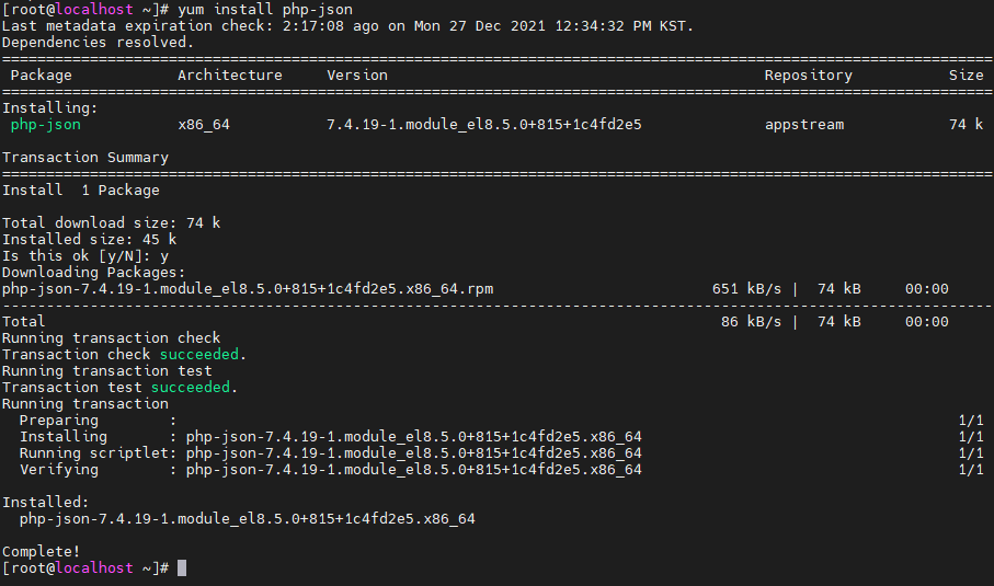 아래의 명령어를 입력하여 php-json을 설치한다. 이는 필자가 작성한 CentOS 8에서의 아파치 웹서버와 PHP 관련 글에서 php-json을 설치하는 항목이 없기에 혹시나 싶어서 쓰는 내용이며 이미 설치된 php-json 모듈이 있다면 넘어가도 된다.