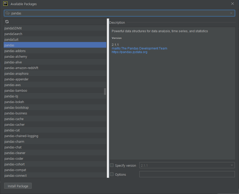 'pandas' 파이썬 모듈을 아래와 같이 설치한다. 아래의 명령어를 입력하여 'pandas' 파이썬 모듈을 설치한다.