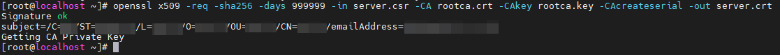 openssl x509 -req -sha256 -days 999999 -in server.csr -CA rootca.crt -CAkey rootca.key -CAcreateserial -out server.crt