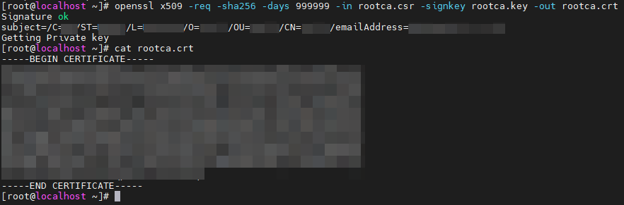 openssl x509 -req -sha256 -days 999999 -in rootca.csr -signkey rootca.key -out rootca.crt
