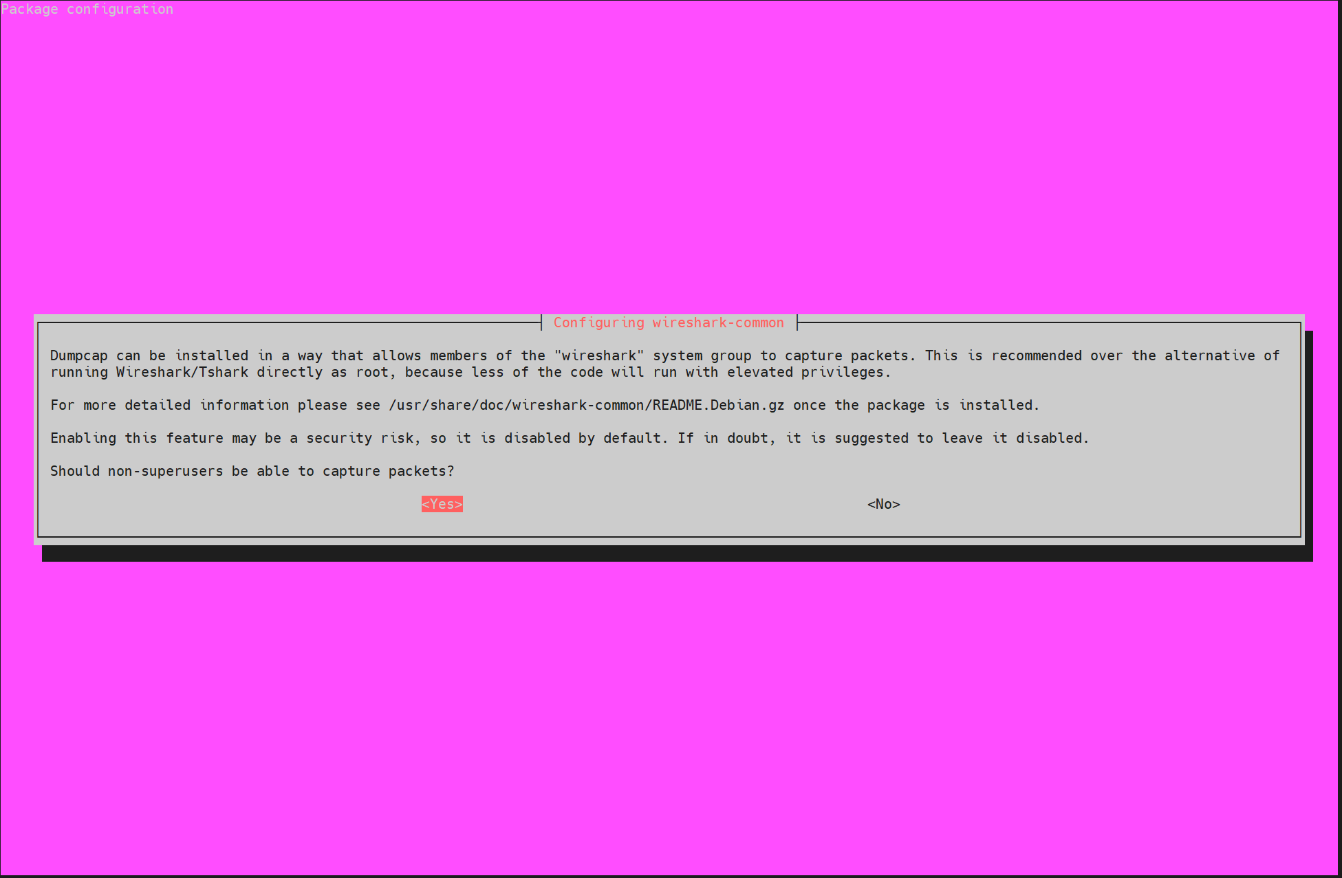위의 화면과 같이 나타나면 ''를 선택하고 엔터키를 누른다. 아래의 명령어를 입력하여 'dumpcap'에 실행 권한을 부여한다.