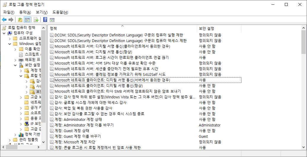 SMB 파일 전송 속도 실험 전에 테스트할 PC의 윈도우 10 보안설정을 확인하였다. 보안 통신(디지털 서명 통신)은 선택적으로 사용가능하게 설정되어 있었다.