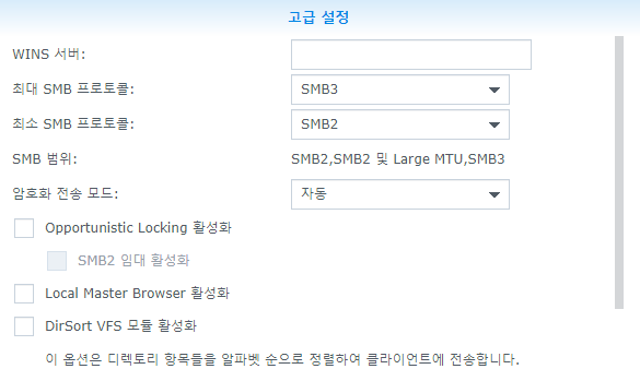 시놀로지에서 SMB2와 SMB3가 지원되게 설정하고 암호화 전송 모드는 자동으로 변경하였다. 처음에는 비활성화로 설정했었는데 그렇게 하니까 윈도우10 탐색기에서 탐색이 되다가 안 되다가 하는 오류가 있었고 자동으로 하니 암호화 통신이 아닌 평문 통신으로 잘 연결되었다.