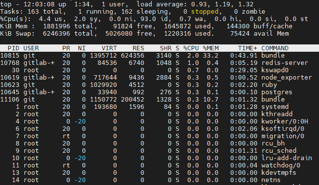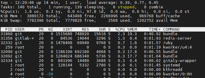 실험 해보니까 전체 메모리가 1,837MB인데 대부분의 메모리가 GitLab 관련 프로그램 구동에 사용된다. 결론은 메모리 2GB에서 GitLab은 못 쓴다.
