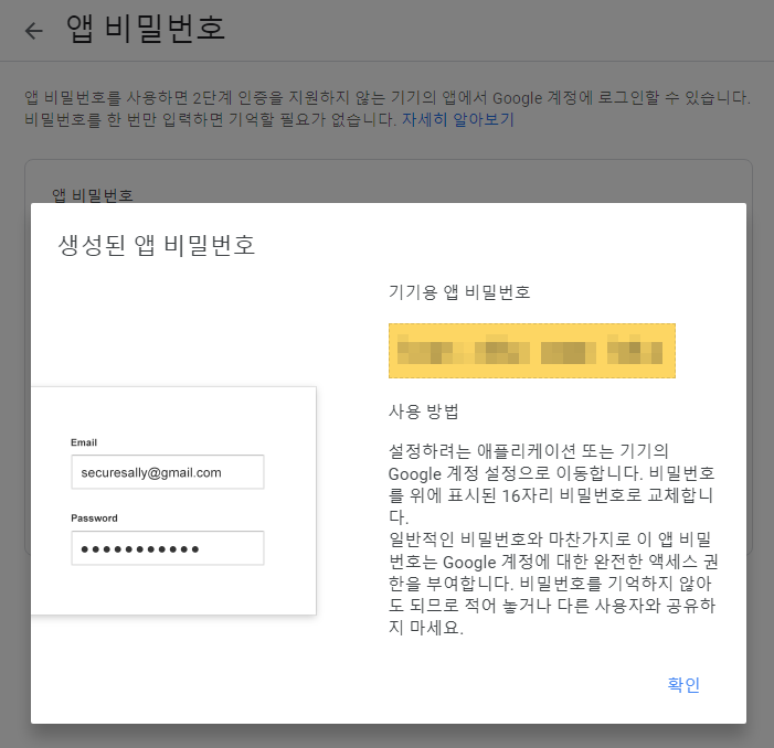 이 부분은 본 글에서 자세히 설명하지 않는다. 구글 정책과 화면이 자주 바뀌어서 적어놓아도 몇달 후면 의미가 없는 경우가 다수 있었기 때문이다. 앱 비밀번호를 발급 받으면 아래의 사진처럼 비밀번호가 나타난다.