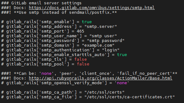 아래의 명령어로 GitLab 설정 파일로 가서 SMTP(Simple Mail Transfer Protocol) 설정을 아래의 사진처럼 수정한다.
