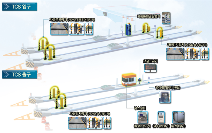 TCS는 크게 입구차선설비와 부스설비, 영업소 설비로 구분한다. [4]에 따르면 국내의 가장 큰 TCS 제조사는 에스트래픽이며 점유율은 80%라고 한다.