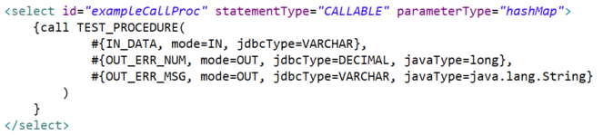 <select id="example_call_proc" statementType="CALLABLE" parameterType="hashMap">