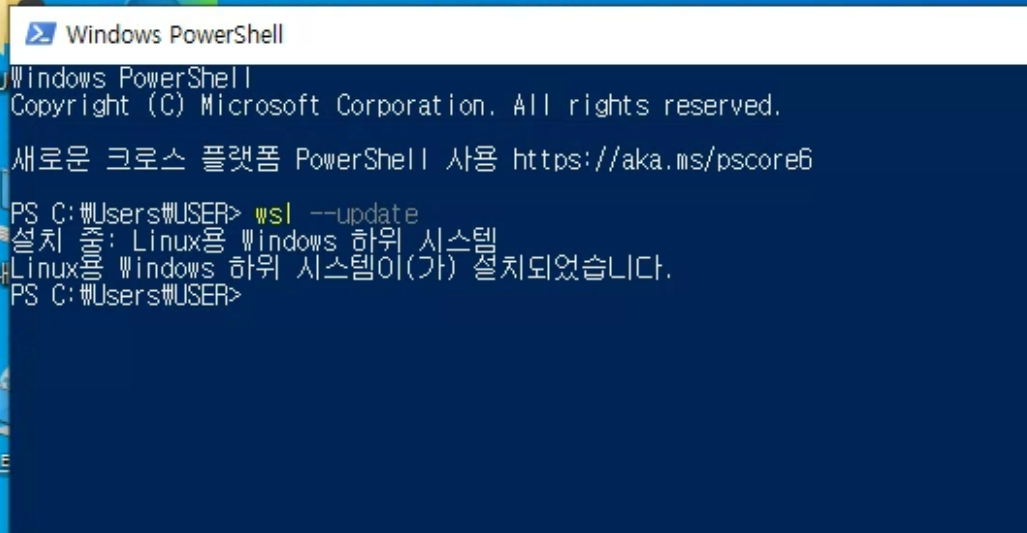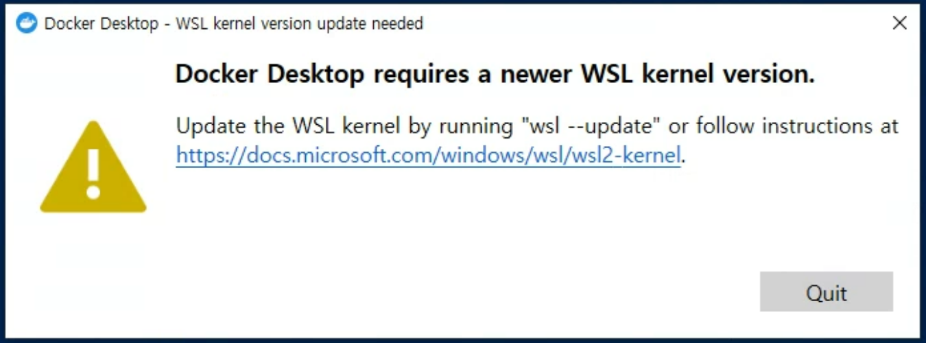 도커(Docker)를 윈도우에서 사용할 때 'Docker Desktop requires a newer WSL kernel version.'라는 메시지와 함께 실행되지 않으면 아래의 명령어를 파워쉘(PowerShell)에 입력하여 해결할 수 있다. 아래의 명령어를 입력하면 WSL(Windows Subsystem for Linux)의 업데이트가 수행된다.