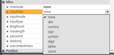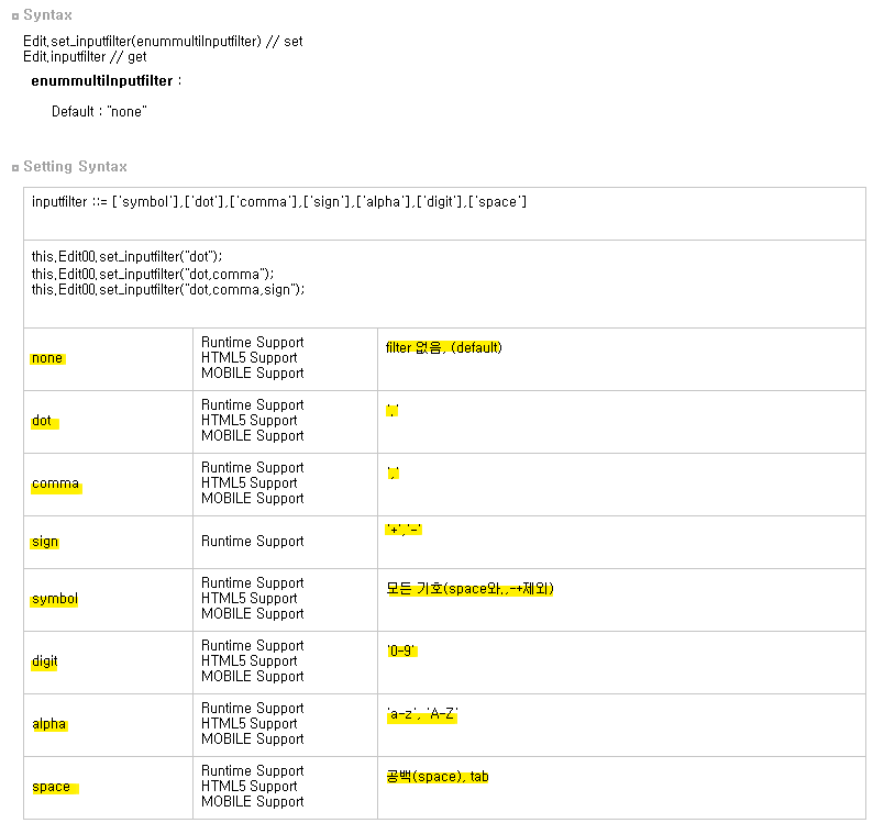 'inputfilter'에 'none'과 'dot', 'comma', 'sign', 'symbol', 'digit', 'alpha', 'space' 같은 속성값을 설정할 수 있으며 각 속성값별 기능은 아래 사진과 같다.