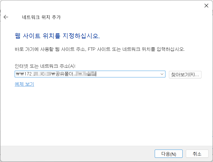위의 사진처럼 설정한 시놀로지의 주소와 접근할 폴더의 명칭을 네트워크 주소 칸에 입력하고 '다음' 버튼을 클릭한다.