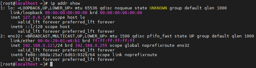 네트워크 인터페이스 목록과 각 인터페이스별 설정 값을 확인한다. 이더넷 네트워크 인터페이스인 "ens32"가 현재 "192.168.0.73"으로 자동(DHCP) 할당되어 있는데 "192.168.0.221"로 변경하겠다.