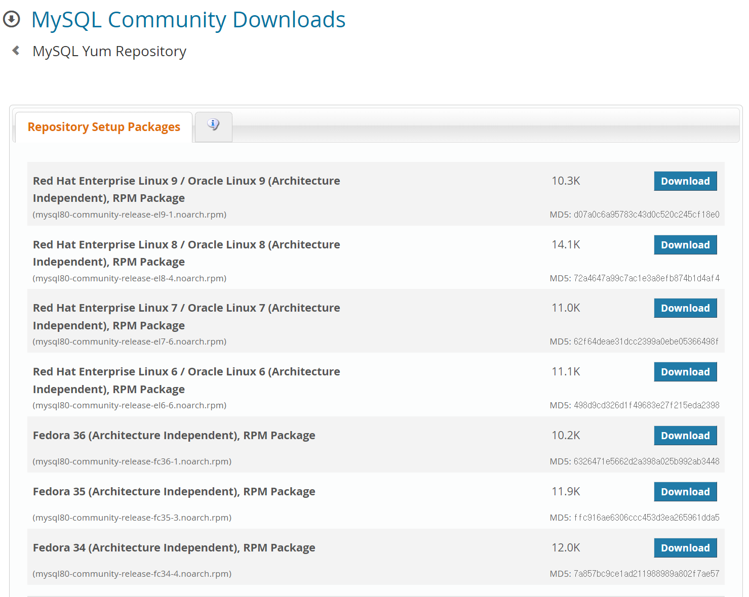 CentOS 7.8의 기본 YUM 저장소에는 MySQL 8.0이 없다. 그러므로 MySQL 공식 홈페이지에서 제공하는 MySQL 8.0 설치파일을 통해 설치를 진행하며 아래의 주소에서 설치가능한 MySQL 정보를 확인할 수 있다.