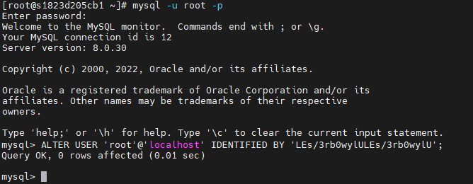 초기 비밀번호로는 정상적인 MySQL 서비스를 이용할 수 없다. 그러므로 root 계정의 비밀번호를 변경해야 한다. 아래의 명령어를 입력하여 mysql 콘솔에 접속한다. 비밀번호를 입력할 때는 위에서 확인한 초기 비밀번호를 입력한다.