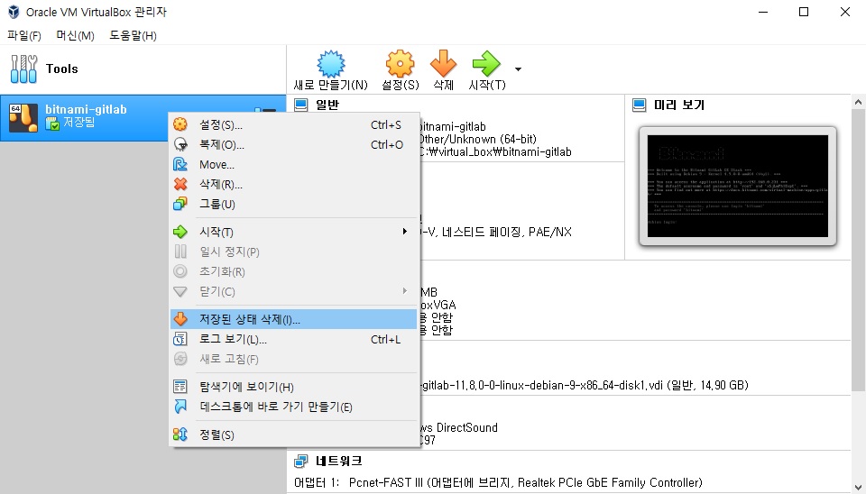 오류 메시지가 "Failed to load unit 'lsilogicscsi'(VERR_SSM_LOADED_TOO_LITTLE)" 이렇게 나온다. 이 경우 이미지를 오른쪽 클릭하여 '저장된 상태 삭제'를 눌러서 시작되지 않는 상태를 지운다.