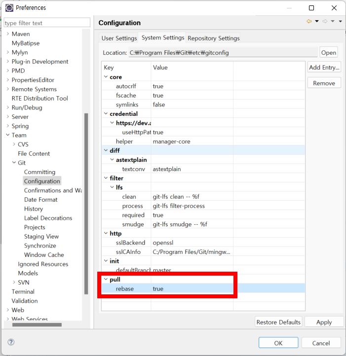 rebase 옵션 값을 수정하는 방법은 여러가지가 있겠지만 이클립스(Eclipse)에서 수정하는 방법은 'Prefereces' - 'Team' - 'Git' - 'Configuration' - 'System Settings' - 'pull' - 'rebase'로 이동하면 설정하는 창이 있다.