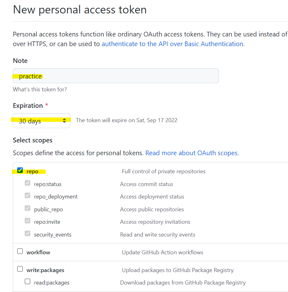 토큰을 구분할 때 쓸 비고(Note)와 유효기한(Expiration), 권한(Scopes)를 설정한다.