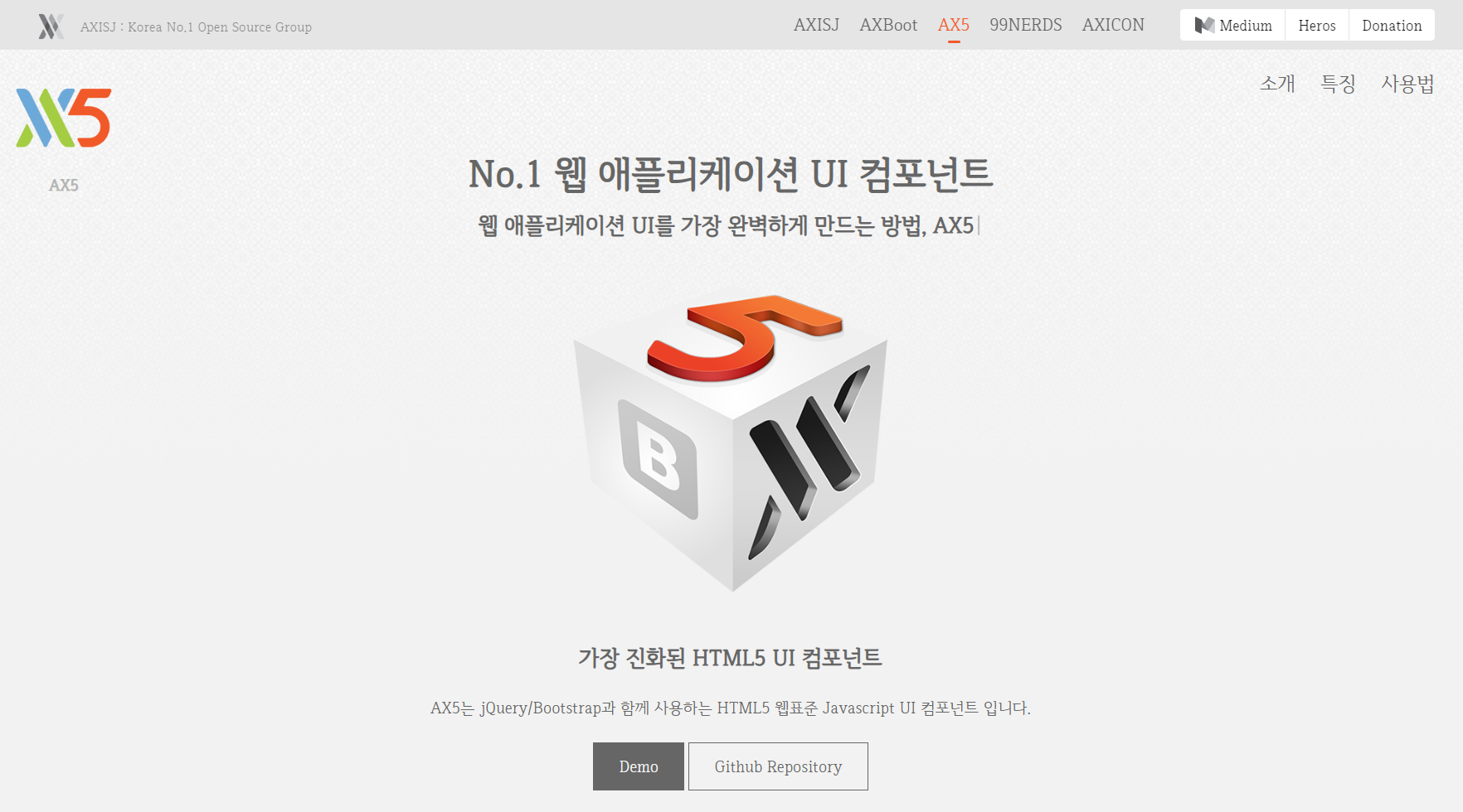 AX5는 jQuery 기반으로 동작하는 라이브러리이며 Bootstrap 호환되기에 Bootstrap 스타일을 쉽게 입힐 수 있다. 오픈 소스 그룹 AXISJ는 한국인 위주로 구성된 그룹이며 한국 정서에 맞는 개발 도구를 제공한다.