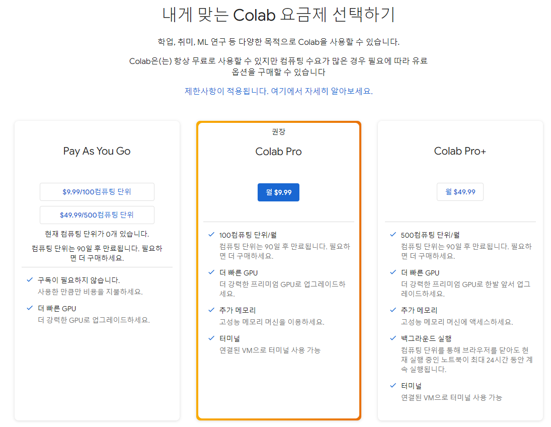 Google Colab은 무료 버전과 유료 버전이 있으며 무료 버전은 최대 12시간 연속으로 프로그램을 실행할 수 있으며 GPU까지 활용할 수 있다.