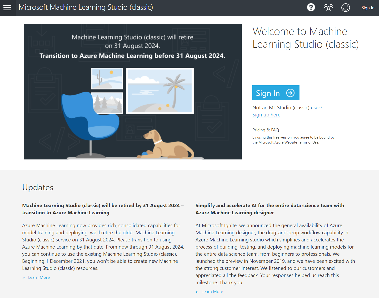 Microsoft Machine Learning Studio는 무료버전과 유료버전이 있으며 2024년 8월 31일에 서비스 종료될 예정이다. Microsoft 사는 Microsoft Machine Learning Studio 대신에 Azure Machine Learning을 이용하는 것을 권장하고 있다.