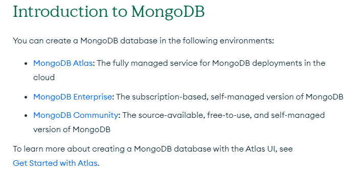 MongoDB는 Atlas와 Enterprise, Community 제품군이 있으며 Atlas의 경우 클라우드 환경의 데이터베이스를 제공하는 것이며 Enterprise는 상용 설치형 데이터베이스 서버 제품이며, Community는 무료 설치형 데이터베이스 서버 제품이다.