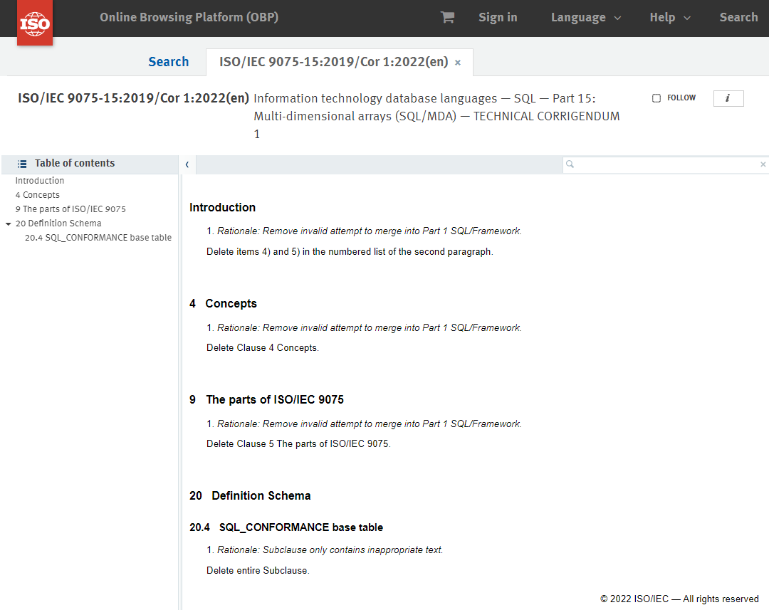 - "ISO/IEC 9075-15:2019/Cor 1:2022 Information technology database languages — SQL — Part 15: Multi-dimensional arrays (SQL/MDA) — Technical Corrigendum 1", ISO, 2022년 6월. @원문보기