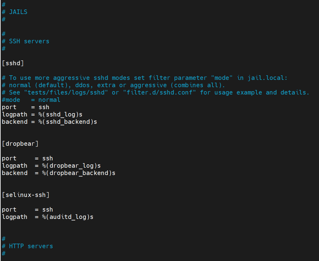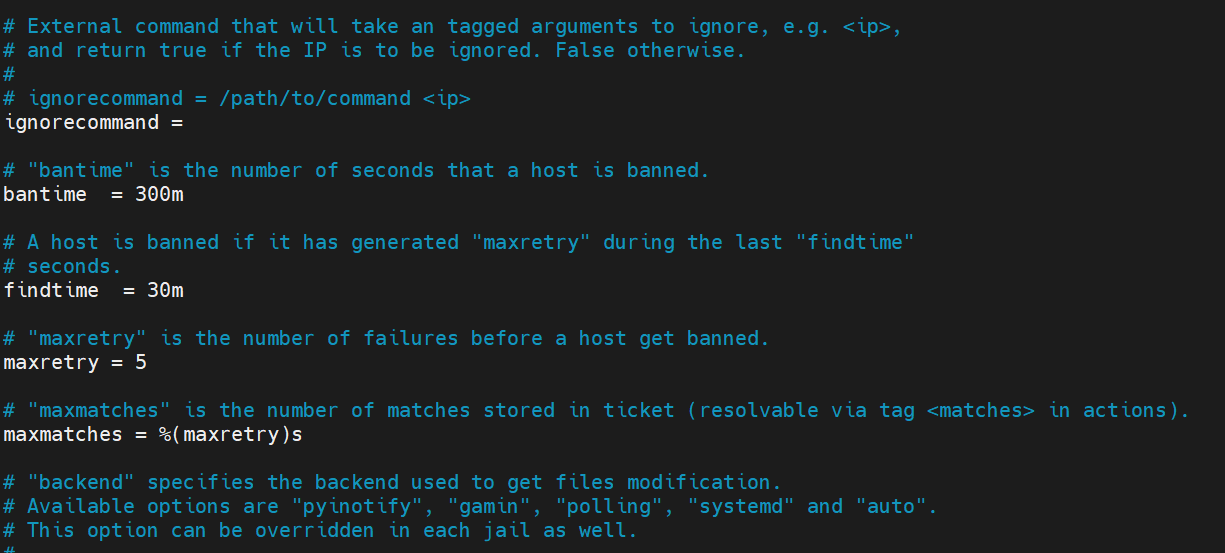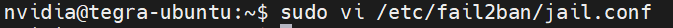 아래의 명령어를 입력하여 fail2ban의 정책을 변경하는 화면에 진입한다.