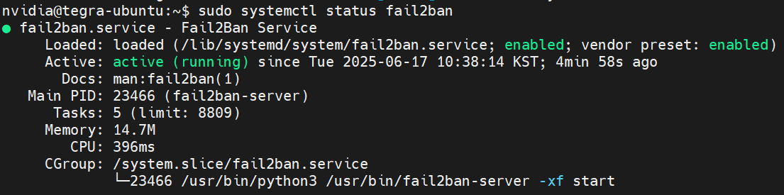 아래의 명령어를 입력하여 fail2ban 서비스의 동작을 확인한다. 초록색으로 'active (running)'이 나타나면 서비스가 잘 실행된 것이다.