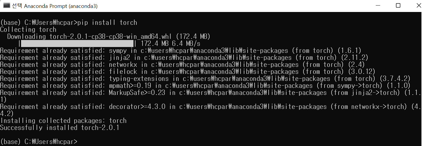 아래의 명령어를 입력하여 'torch' 패키지를 설치한다. 명령어를 실행하면 아래의 사진처럼 실행된다.