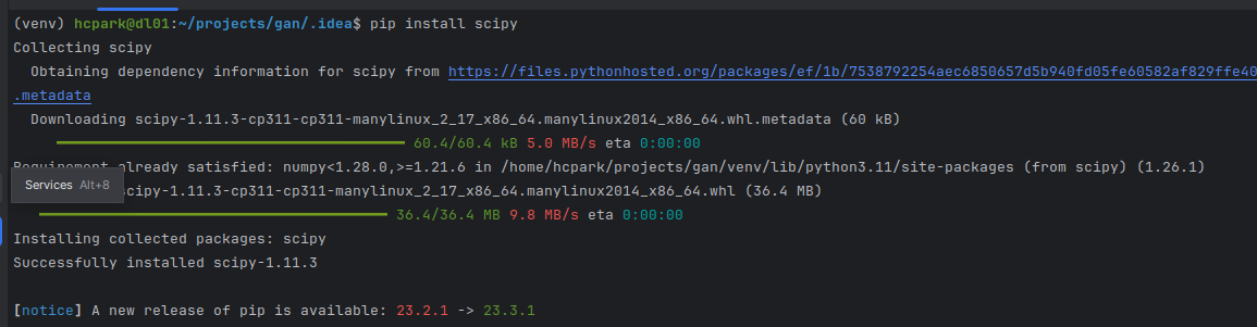 'scipy' 파이썬 모듈을 아래의 방법으로 설치한다. 아래의 명령어를 입력하면 'scipy' 모듈을 설치할 수 있다.