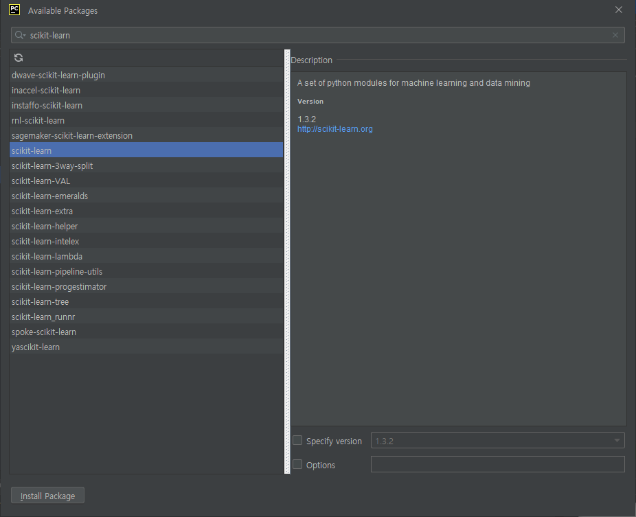 파이참을 사용 중이라면 아래와 같은 화면에서 GUI로 'scikit-learn' 모듈을 설치할 수 있다.