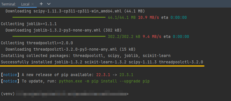 아래와 같은 방법으로 'scikit-learn' 파이썬 모듈을를 설치한다. 아래의 명령어를 입력하여 'scikit-learn' 모듈을 설치한다.