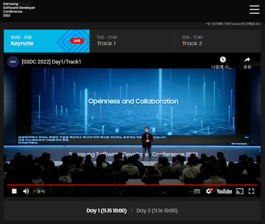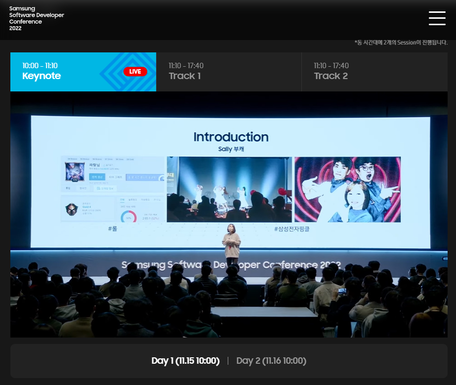 지난 2022년 11월 15일(화)부터 16일(수) 이틀간 진행된 SSDC(Samsung Software Developer Conference) 2022에 온라인으로 참석했다. 본업이 있고 업무 연관성이 적기 때문에 오프라인 참석을 할 수는 없었는데 행사 내용이 온라인으로 제공되어서 좋았다. 컨퍼런스에서 제공되는 내용이 알찼다. 확실히 국내는 물론 전세계적으로 모이는 엘리트 집단인 삼성이라서 그런지 명확하고 이해하기 쉽게 발표하는 것을 느꼈다. 업무 중이라 키노트 세션을 라이브로 다 보지는 못 했지만 꽤 인상 깊었다.
