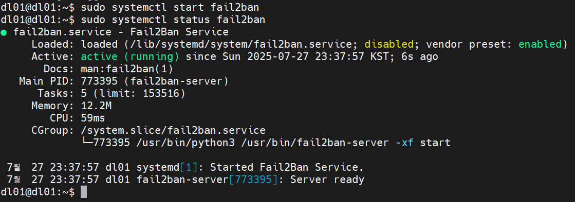 아래의 명령어로 Fail2Ban 서비스를 실행한다.
