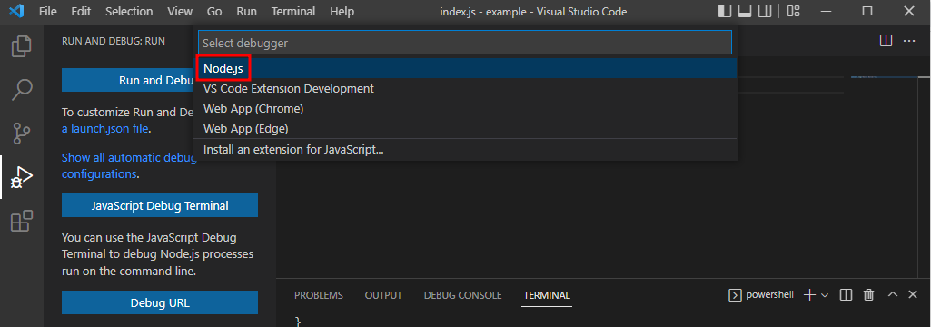 위의 사진처럼 Node.js 를 클릭하면 Node.js 프로그램에 맞춰서 프로그램 실행과 디버깅이 자동으로 설정된다.