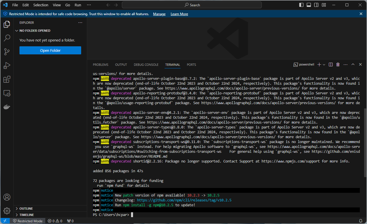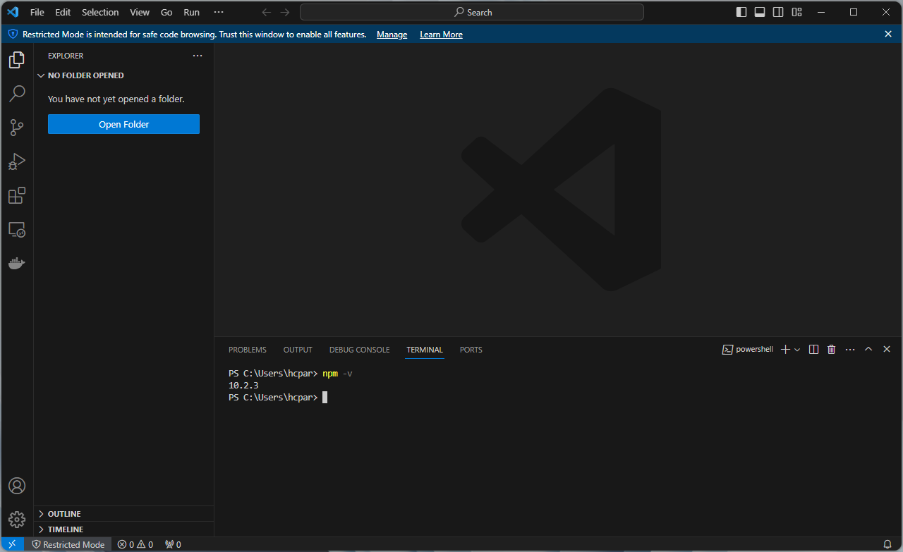 Node.js 설치가 잘 되었는지 확인하기 위해 위의 사진처럼 Visual Studio Code에서 터미널을 연다. 그 후 아래의 명령어를 입력하여 아래의 사진처럼 버전 정보가 잘 나오는지 확인한다.