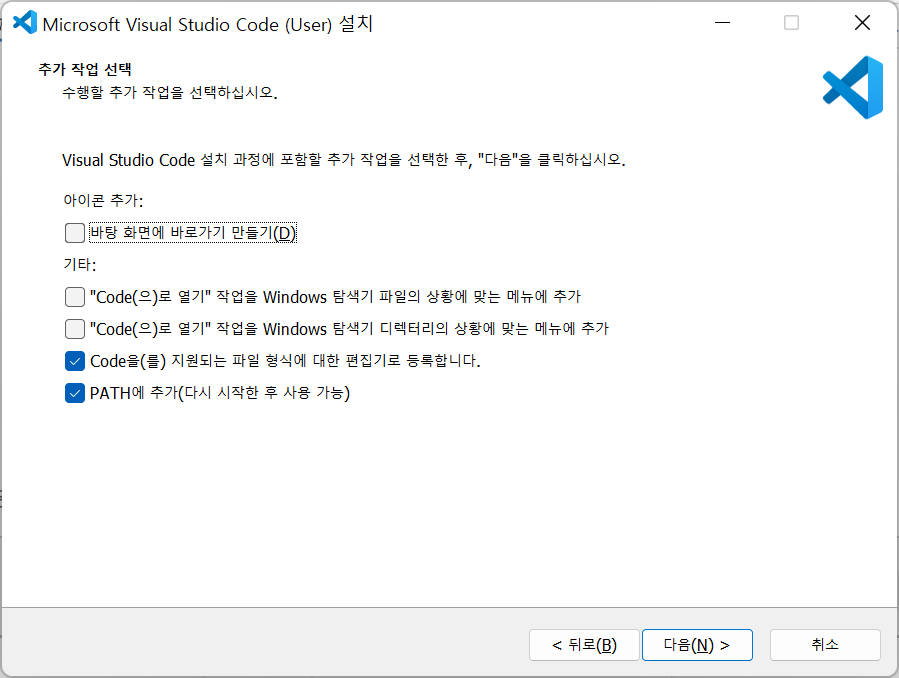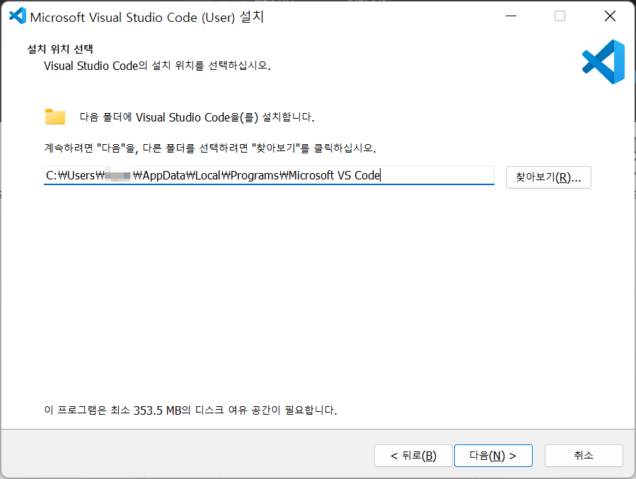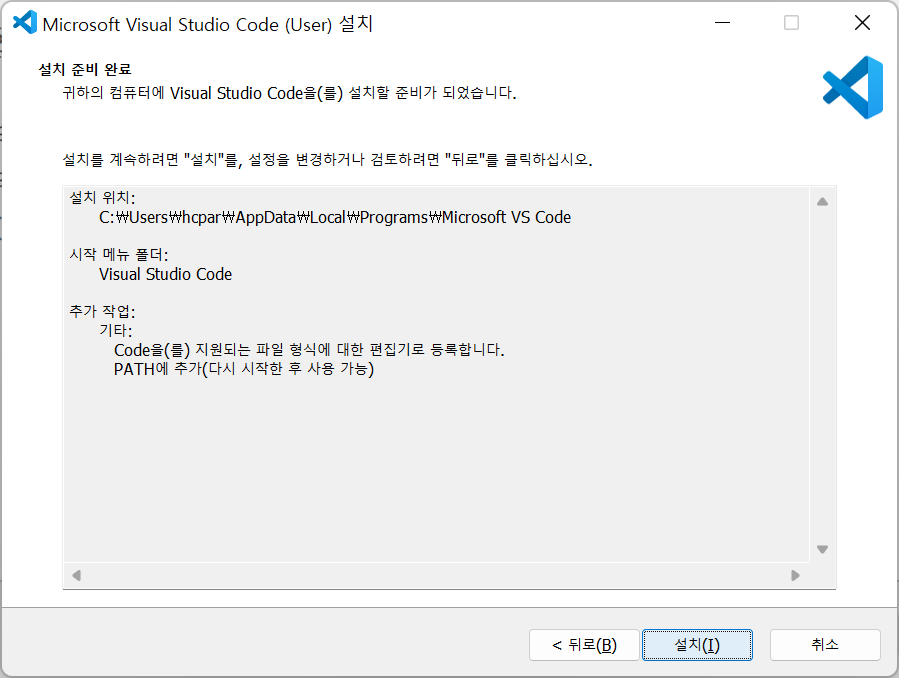 다운로드된 설치파일을 실행하여 아래의 사진처럼 설치한다. 본 글에서는 윈도우 11 64비트를 기준으로 설명한다.