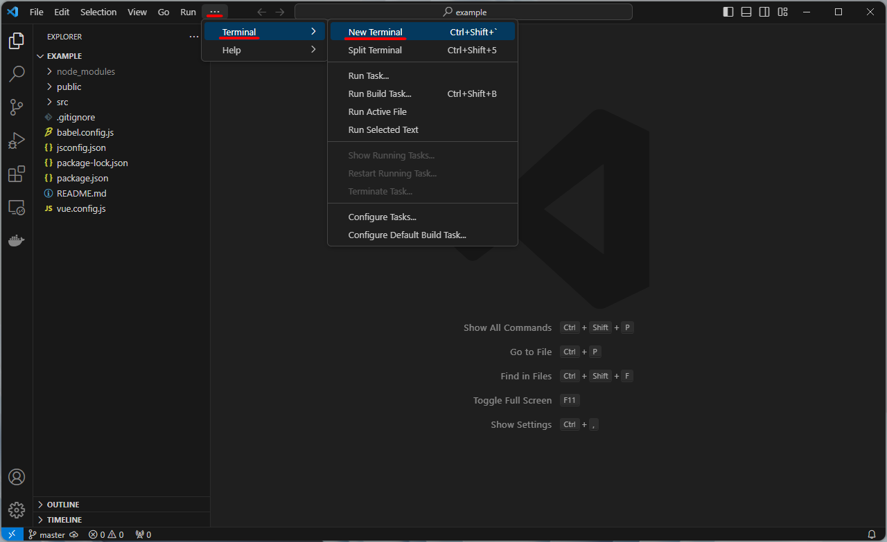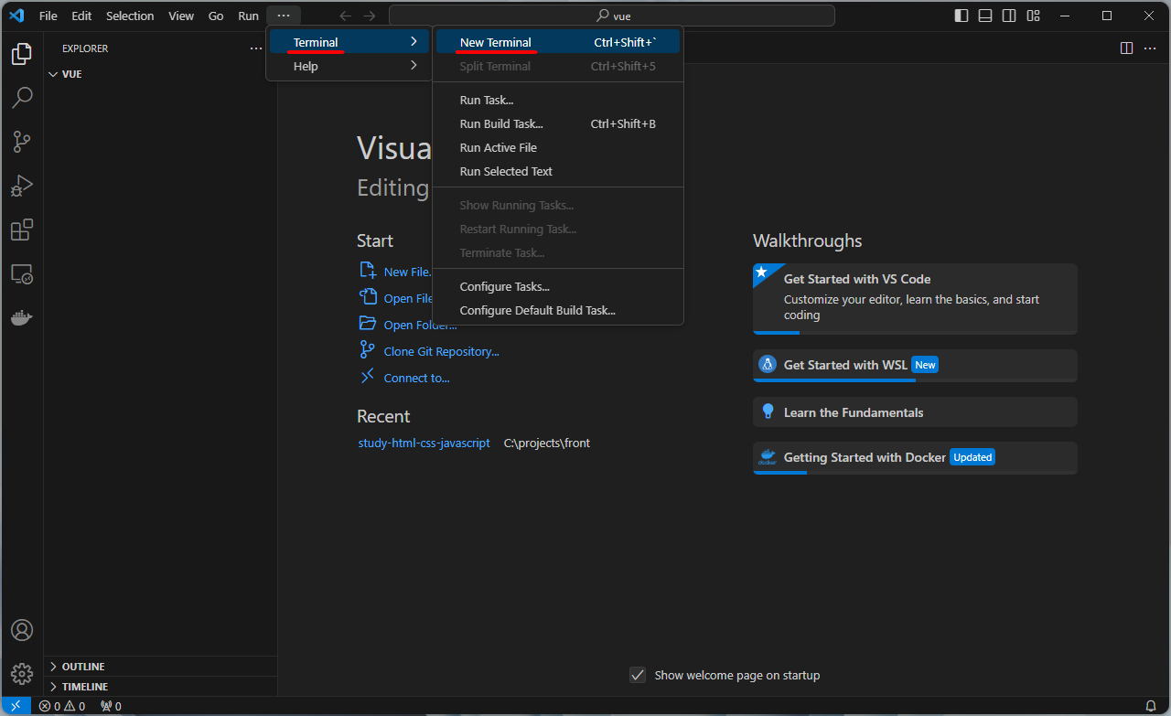 생성한 Vue.js 프로젝트가 잘 동작하는지 확인하기 위하여 아래의 사진처럼 터미널을 열고 터미널에 아래의 명령어를 입력한다.