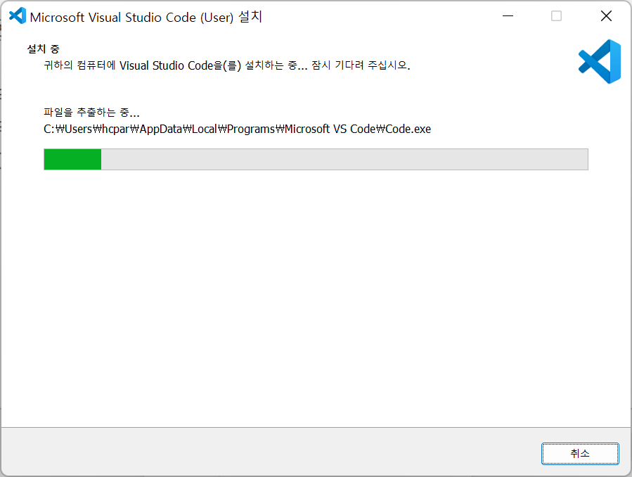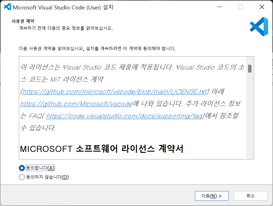 다운로드된 설치파일을 실행하여 다음과 같이 설치한다. 본 글에서는 윈도우 11 64비트를 기준으로 설치 과정을 설명한다.