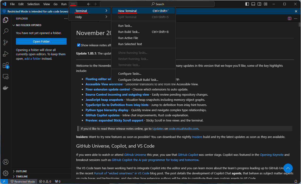 선택한 작업 폴더에 Vue CLI로 Vue.js 프로젝트를 생성하기 위해 터미널을 아래의 사진처럼 연다.