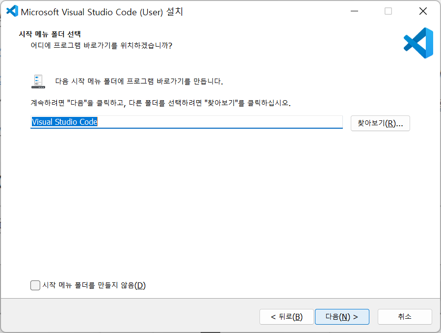 시작 메뉴 폴더명을 적절하게 설정하고 '다음' 버튼을 클릭한다.