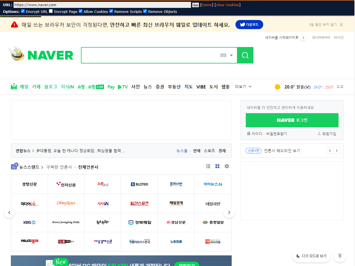 PHP 기반으로 작성된 웹 프록시(Web Proxy)가 오픈 소스로 되어 있는 것이 있나 싶어서 찾던 중에 'glypeproxy'를 찾았다. 구축하고 써봤는데 생각보다는 꽤 잘 되었지만 동적으로 읽어오는 웹 페이지에서 동작이 문제가 있어서 내가 사용하는 용도로 쓸 수는 없었다. 요즘처럼 동적으로 읽어오는 페이지가 많은 경우에 대응해서 'glypeproxy'의 기능 업데이트가 필요하다.