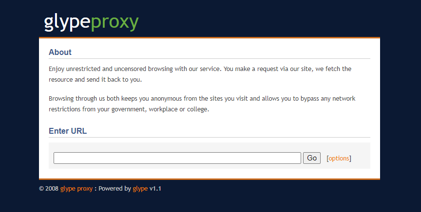 PHP 기반으로 작성된 웹 프록시(Web Proxy)가 오픈 소스로 되어 있는 것이 있나 싶어서 찾던 중에 'glypeproxy'를 찾았다. 구축하고 써봤는데 생각보다는 꽤 잘 되었지만 동적으로 읽어오는 웹 페이지에서 동작이 문제가 있어서 내가 사용하는 용도로 쓸 수는 없었다. 요즘처럼 동적으로 읽어오는 페이지가 많은 경우에 대응해서 'glypeproxy'의 기능 업데이트가 필요하다.